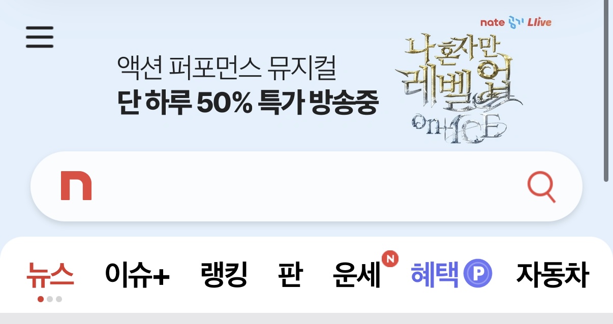 네이트 검색창 단독 배너를 통해, 아이스 뮤지컬 <나 혼자만 레벨업> 초대이벤트를 진행했습니다!